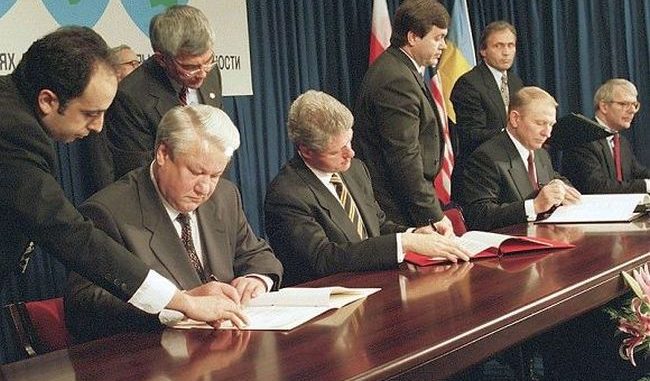 После распада СССР на территории Украины остался огромный ядерный арсенал, который де факто не принадлежал Украине, поскольку коды активации ядерного оружия продолжали находиться в Москве. Иными словами: привести в действие это оружие можно было только из Москвы, а без ее разрешения извлечь боеголовки было невозможно из-за механизма самоуничтожения при несанкционированном доступе. москва была категорически против передачи Украине кодов активации, охраны и обслуживания этого арсенала, а Украина была категорически против того, чтобы на ее территории Москва содержала ядерные базы, к которым у Украины нет доступа. Формально склады и пуковые шахты теперь принадлежали Украине, но лишь формально, поскольку воспользоваться ими Украина не могла. Тогда украинские политики решили извлечь политическую и  экономическую выгоду из отказа от ядерных вооружений, тем более в то время экономическое положение бывшего СССР было ужасным. При участии Ядерного Клуба – России, США и Великобритании – в 1994 году был подписан Будапештский Меморандум юридическая суть которого состоит в том, что Украина становится неядерной державой, а взамен ядерного оружия названные страны обеспечат Украине те же возможности, что у нее были бы, владей она ядерным оружием.